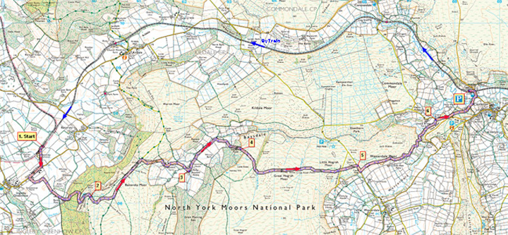 - (Start – Battersby Junction station) Leave the platform and walk past the former railway cottages along the lane to the road and turn right. In about ¼ mile (400m) turn left along a lane, which leads to the buildings at Bank Foot. This is where the old Rosedale railway from Battersby began its climb up onto the moors – its path is now used as a forestry road to the foot of Ingleby Incline. However, our walk makes a direct assault on the escarpment by keeping to the stony track, which zig-zags up through the trees past disused quarries.