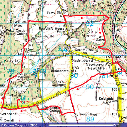 - (Start) From the car park, walk back down to the road and turn right. In about ¼mile turn right at the junction (SP Keldy). Head north along this lane for about ½mile – it can be quite busy with traffic to and from the Forest Cabins at Keldy. From the top of the hill you get a good view north over the forest. Opposite a farm at the bottom of the hill take a path (no SP at present) on the right into woodland. This path picks its way through mixed woodland with views right of the escarpment on which is situated Cawthorne Camp. The path swings north to cross a stream and climbs steadily until the woodland thins and you come across open farmland. Head across the field to the gate opposite – High Cawthorne farm is to the left and Elleron Lodge through the trees on the right..