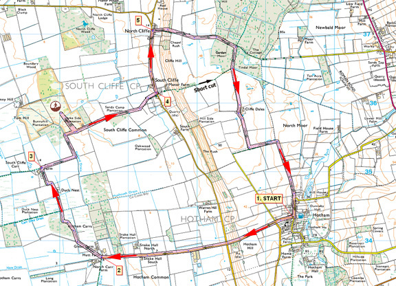 - (Start) From the war memorial in Hotham set off up the road opposite the Hotham Arms, and straight on over Four Lane Ends crossroads. Continue up and over the hill down to another crossroads. Head west from here along a narrow lane, Carr Lane, which brings you in about 1¼ miles (2.0km) to North Carr Farm
